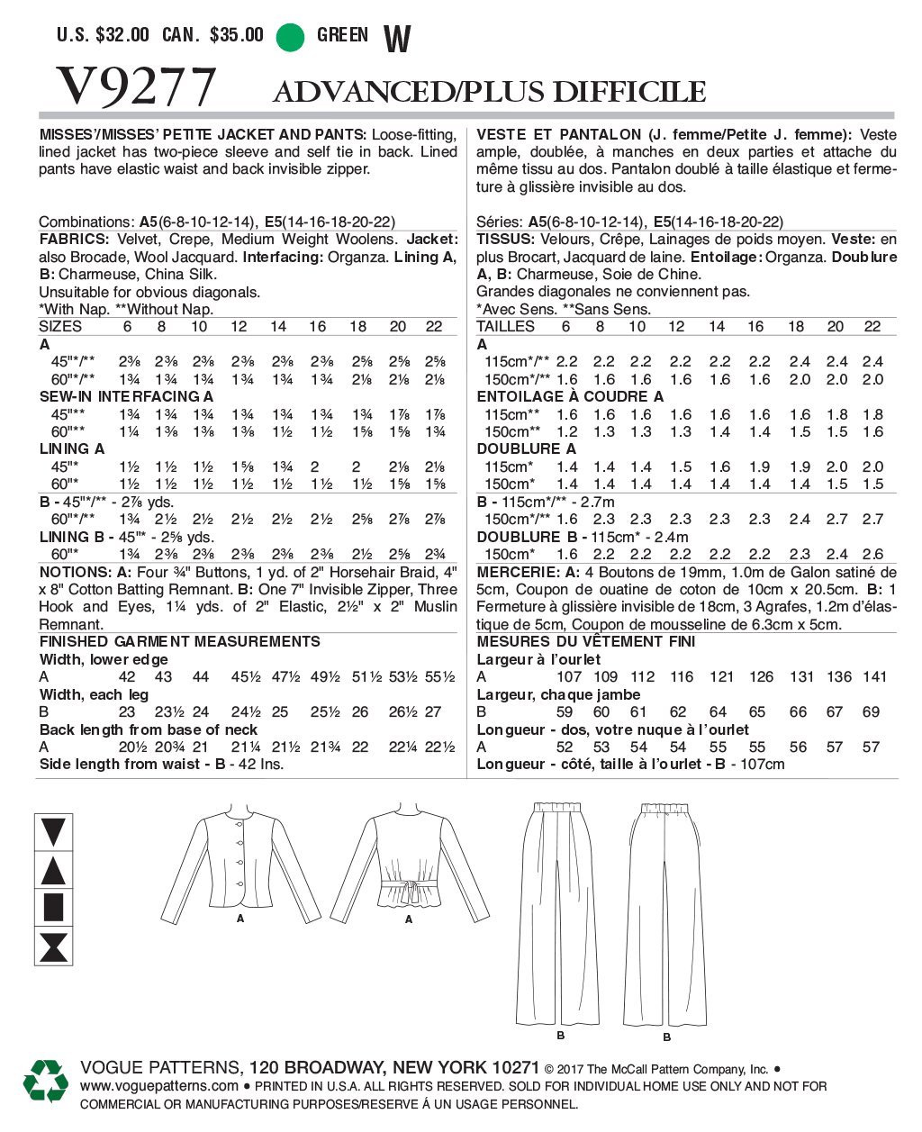 Sewing 6 8 10 12 14 Vogue Patterns V9277a50 Misses Petite Jacket With Back Tie And Pull On Pants Pattern Green Sewing Patterns Templates